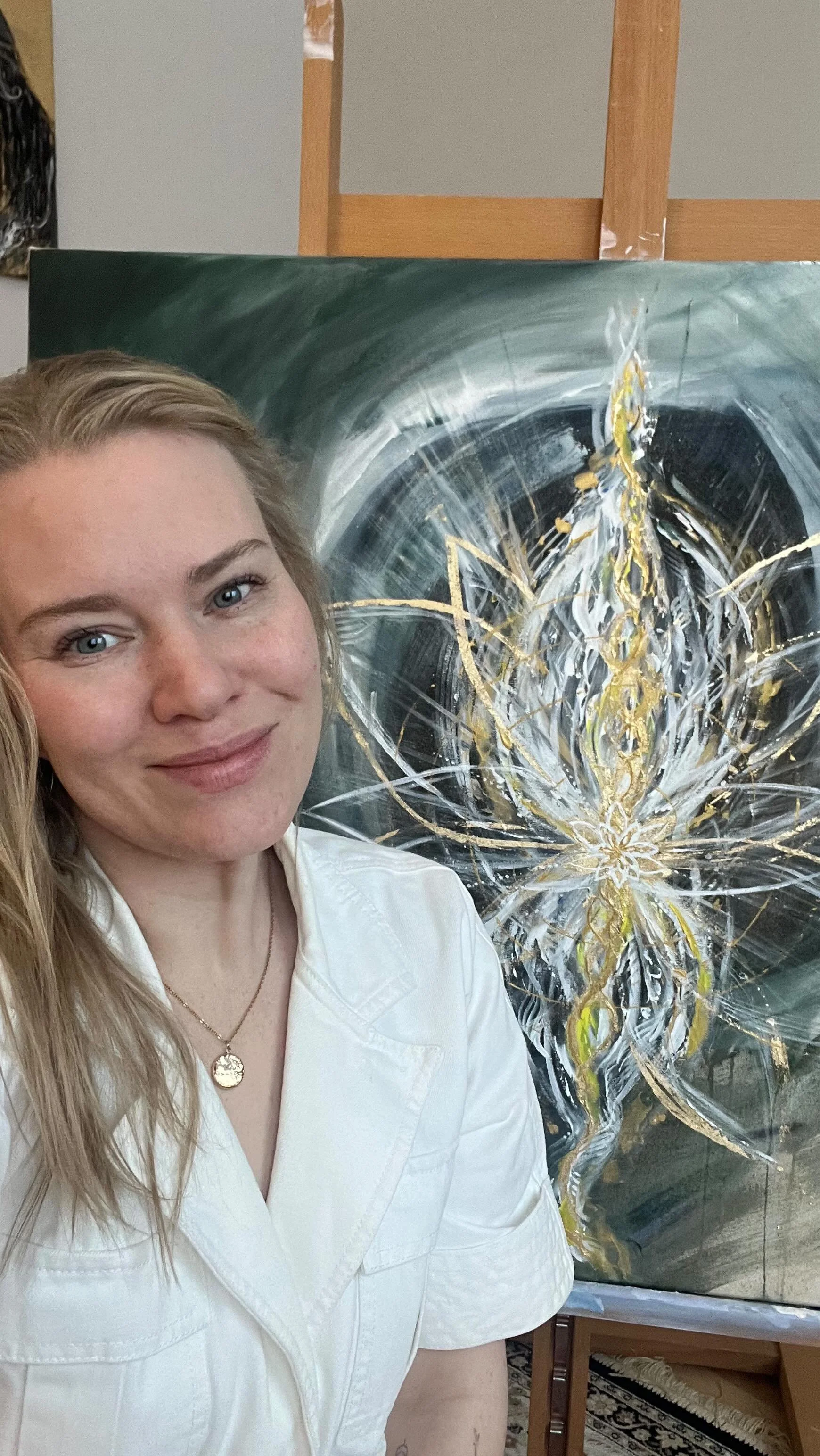 “Se oli mykistävää. Kaikki vain tapahtui, jokainen kuvio, siveltimen veto, väri, muoto ja kosketuksesi tauluun oli merkityksellinen. Kaikki se mitä sanoitit tauluun syntyvän resonoi minussa vahvasti. Syvä suru ja suuri menetyksenikin löysi paikkansa kuten myös sieluntehtäväni ja kaikki minulle voimaa tuovat elementit ilmentyivät teokseen.”